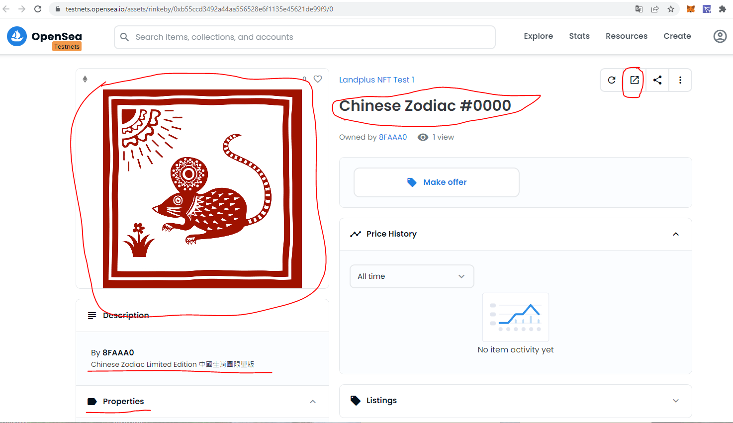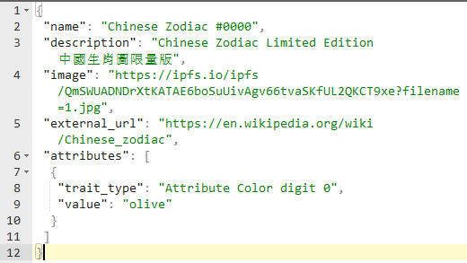Chinese Zodiac #0000In this NFT, you can see the name, image, description, properties and a URL to external site. They are defined in metadata in this way: